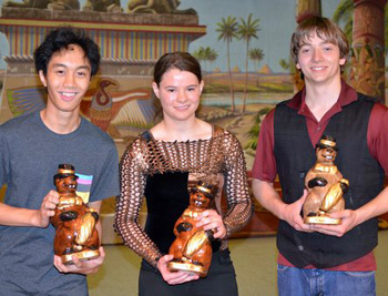 The Seed and Feed Marching Abominable Band, celebrating their 40th anniversary this year, opened the public show with a rousing set of brass-heavy tunes. The Juggling Competition had 10 acts, herded along by our own President Andy Ford. IJA Juniors champion Delaney Bayles (Salt Lake City, Utah) was the "Most Outstanding" act, with a routine which included some 5-ball tricks, four-ring pancakes, 5-ring pull-offs and pull-ons, and ended with a 5-club 3-up pirouette. Brandon Zaballero took the "Most Terrific" trophy, with an act which also included several 5-ball tricks, some interesting 3-ring body-roll tricks, and a short run of 7 rings. St. Petersburg's Dan Brown took home the "Most Stupendous" prize; his act included 5 ball back-crosses, a solid run of 7 balls, 5-club back-crosses, and a brief juggle of 6 clubs.